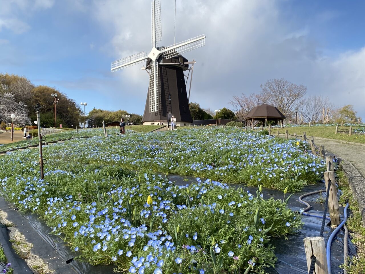 1年を通して、季節の花で彩られる風車の丘では、ネモフィラとチューリップが咲き始めていました。