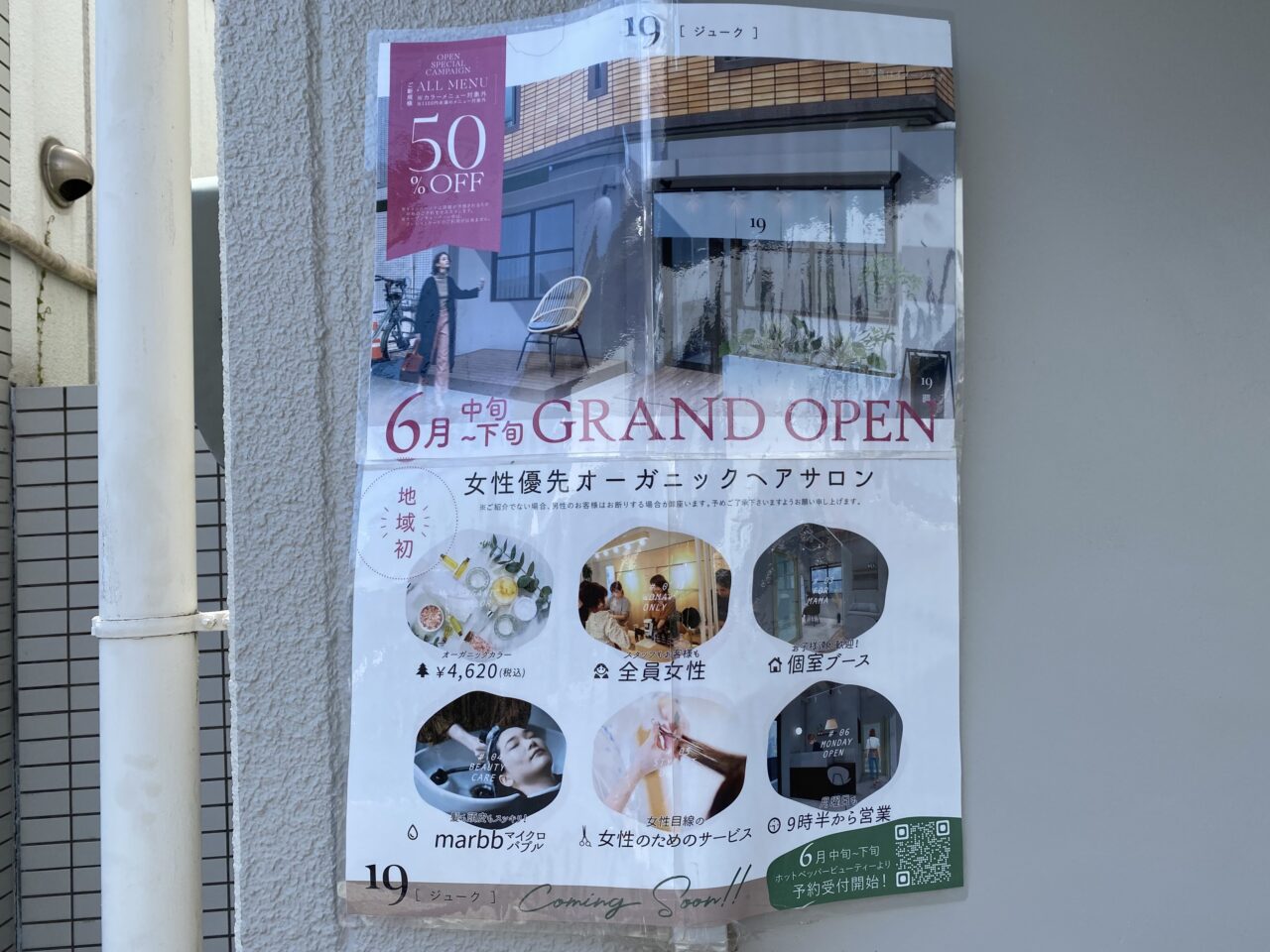 横堤2丁目に、『19(ジューク)』というヘアサロンがオープンするようです。