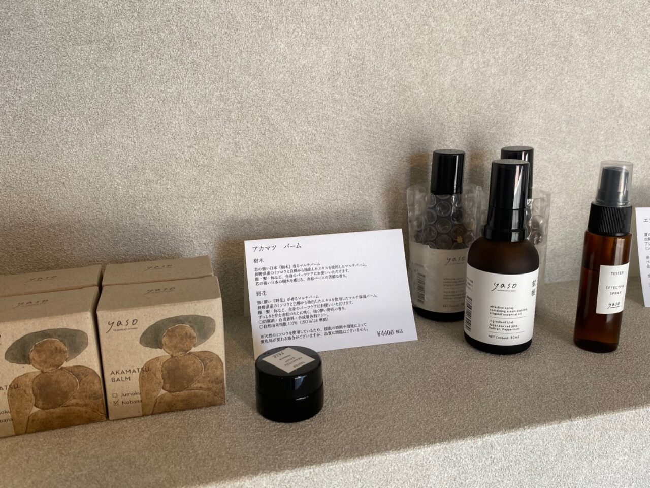 「yaso(ヤソ)」は、森林資源の利活用に取り組むプロジェクトで、お茶以外にも、バームやハンドソープなどの商品もありましたよ。