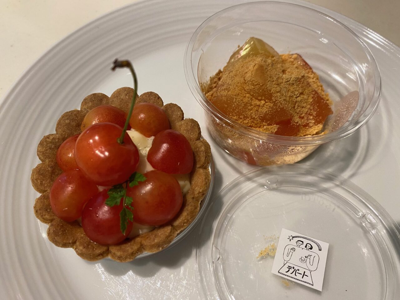↓テイクアウトした「さくらんぼのタルト」(季節限定)と「パプリカのわらびもち」