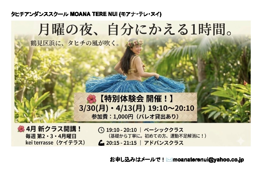 タヒチアンダンススクール『MOANA TERE NUI(モアナテレヌイ)』の新クラスが開講されたそうです。